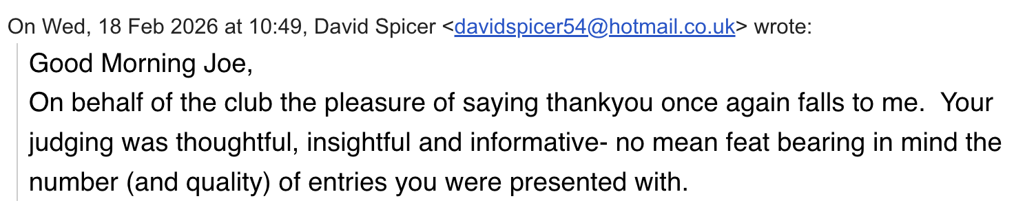 He has judged both in person, & mostly these days via Zoom and can do either “live” sessions where he only sees the images as they are presented, or pre-judging, where the images are sent ahead of the club session for review and scoring.